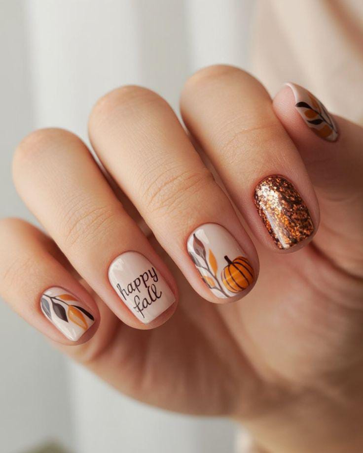 A soft nude base with delicate fall leaves, pumpkins, and a touch of sparkling copper glitter creates a cozy, seasonal vibe perfect for November evenings.
