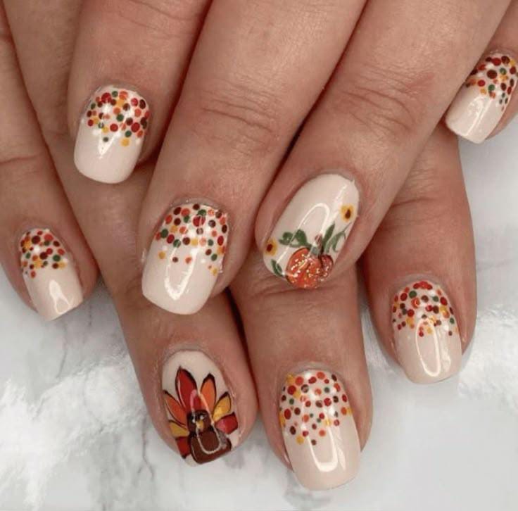 Playful dotted tips in autumn shades paired with pumpkins, sunflowers, and a cute turkey accent nail capture the cheerful spirit of Thanksgiving.