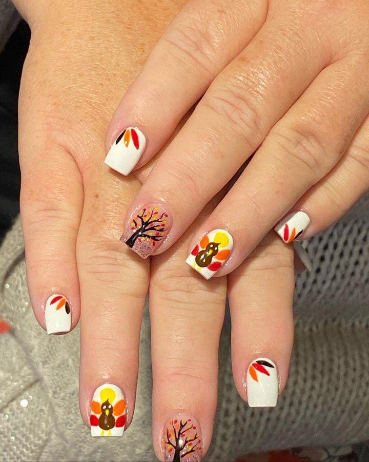 Crisp white nails decorated with colorful falling leaves, bare autumn trees, and turkey art bring a festive yet rustic November feel.