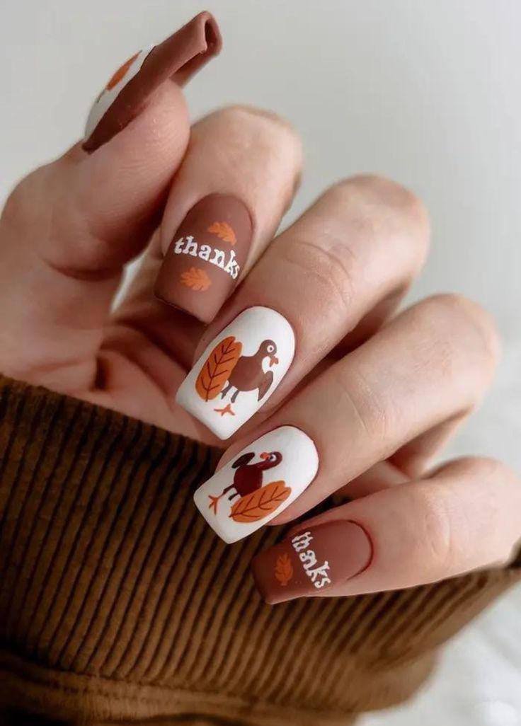 Matte brown and white nails feature bold turkey designs and “thanks” lettering, giving a modern yet traditional Thanksgiving-inspired look.
