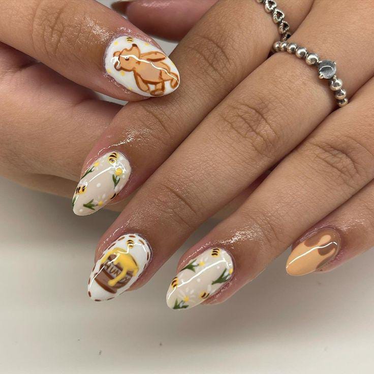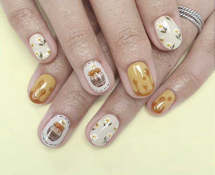 Soft and whimsical, these nails bring together cuddly bears, honey jars, and tiny buzzing bees for a sweet November vibe.