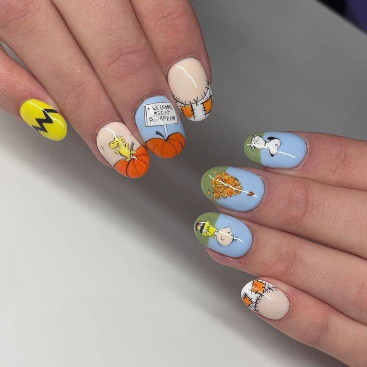 Inspired by the playful charm of the Peanuts characters, these nails feature bright pumpkins, light blue skies, and whimsical comic details. The cheerful artwork adds a touch of nostalgia while tying in classic November themes.