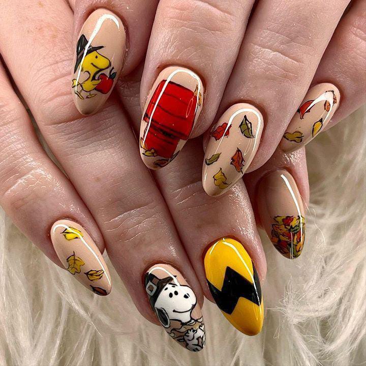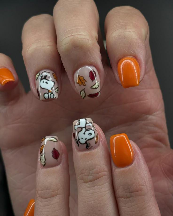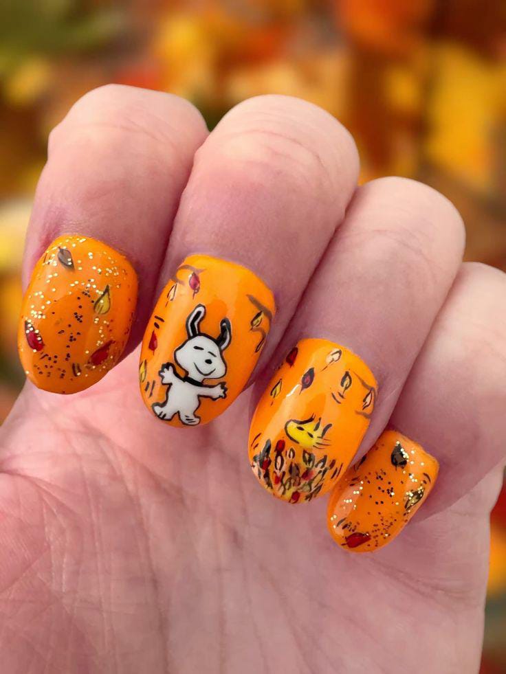 Bright orange nails with playful cartoon details, falling leaves, and a Snoopy character bring out the cheerful, festive side of November. It’s bold, fun, and full of personality.