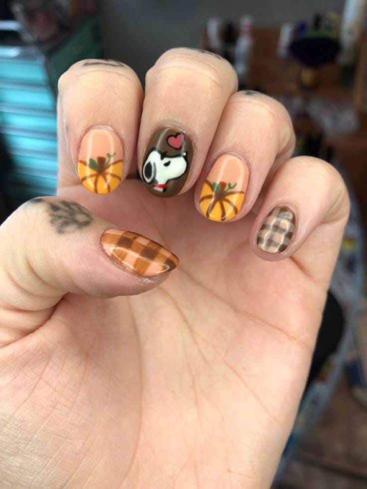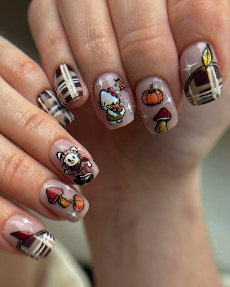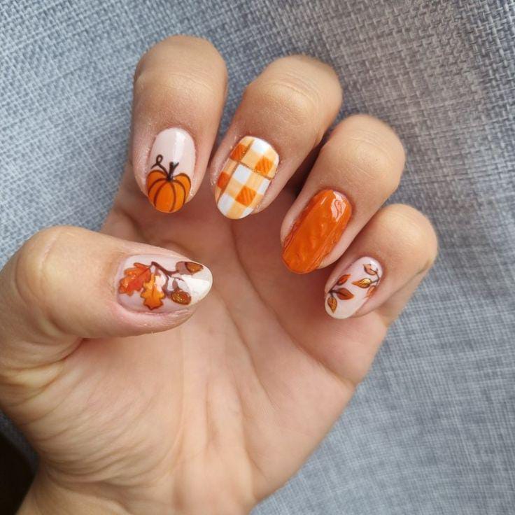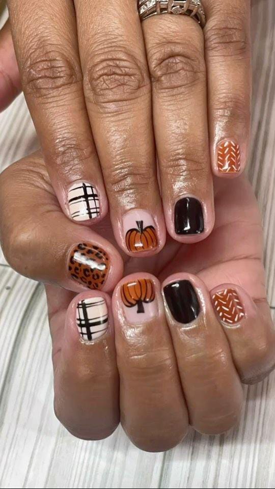 Playful short nails with pumpkins, plaid stripes, and earthy tones paired with hints of animal print, giving a rustic yet trendy November vibe.