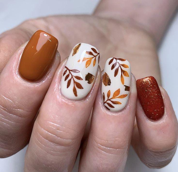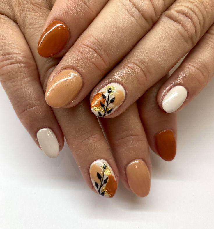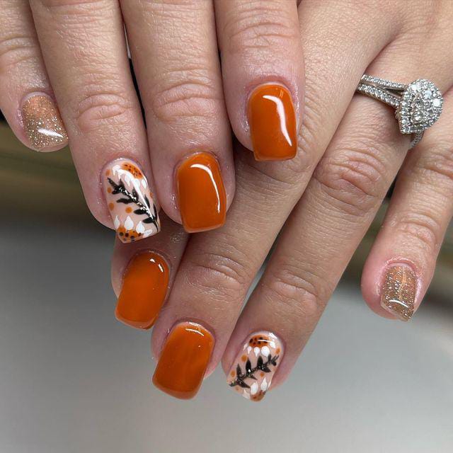 Bright burnt-orange nails are paired with delicate leafy patterns and soft gold shimmer, creating a look that feels both rustic and elegant.