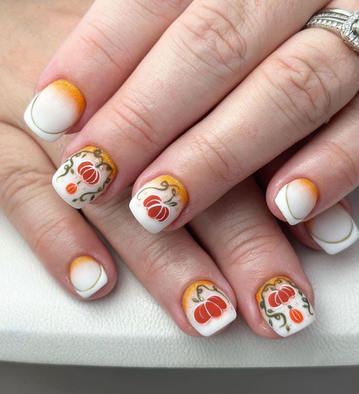 This design blends a creamy white base with warm golden cuticles, highlighted by hand-painted pumpkins and curling vines that feel festive yet elegant.