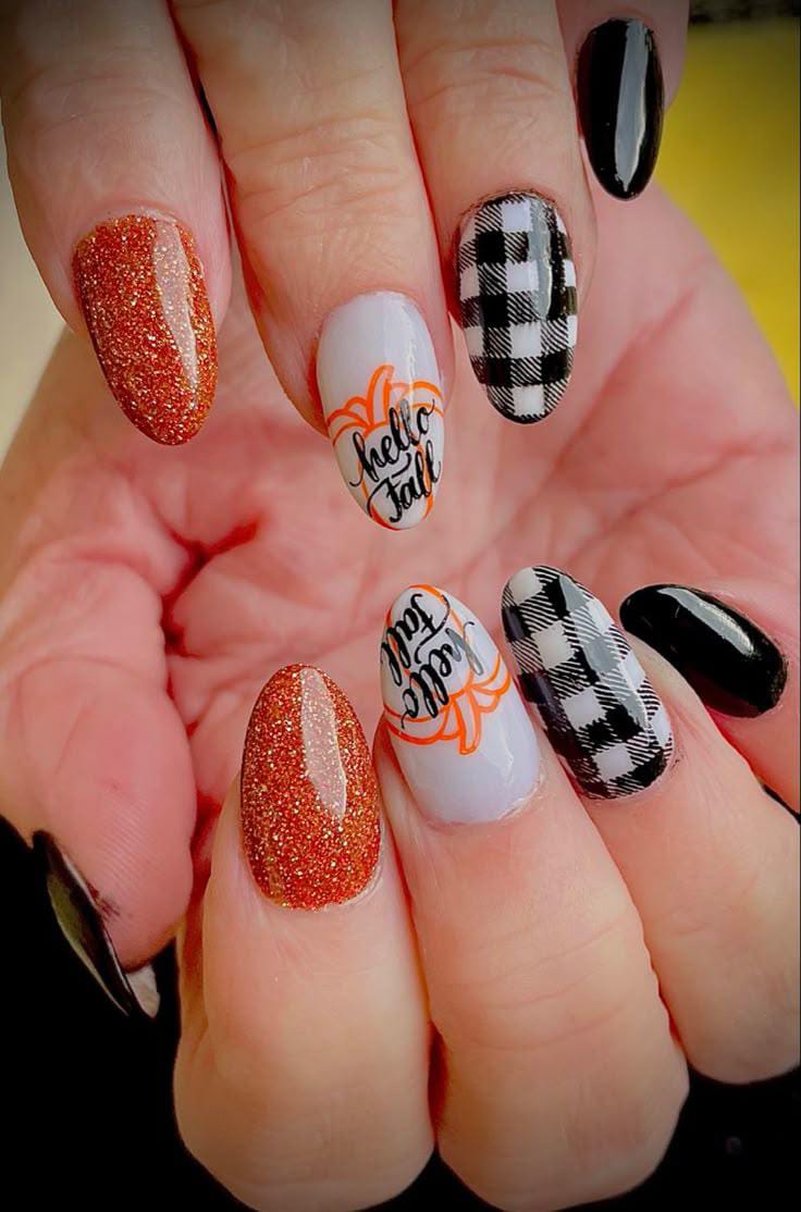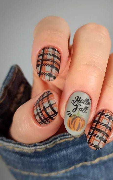 Rich plaid patterns in earthy tones are paired with an accent nail that says “Hello Fall” alongside a pumpkin detail. The mix of cozy prints and seasonal wording makes this look perfect for November gatherings.