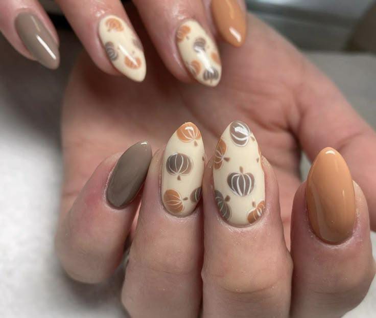 Soft shades of beige, tan, and taupe are styled with scattered pumpkin motifs across the nails, giving off a chic yet cozy, autumn vibe.