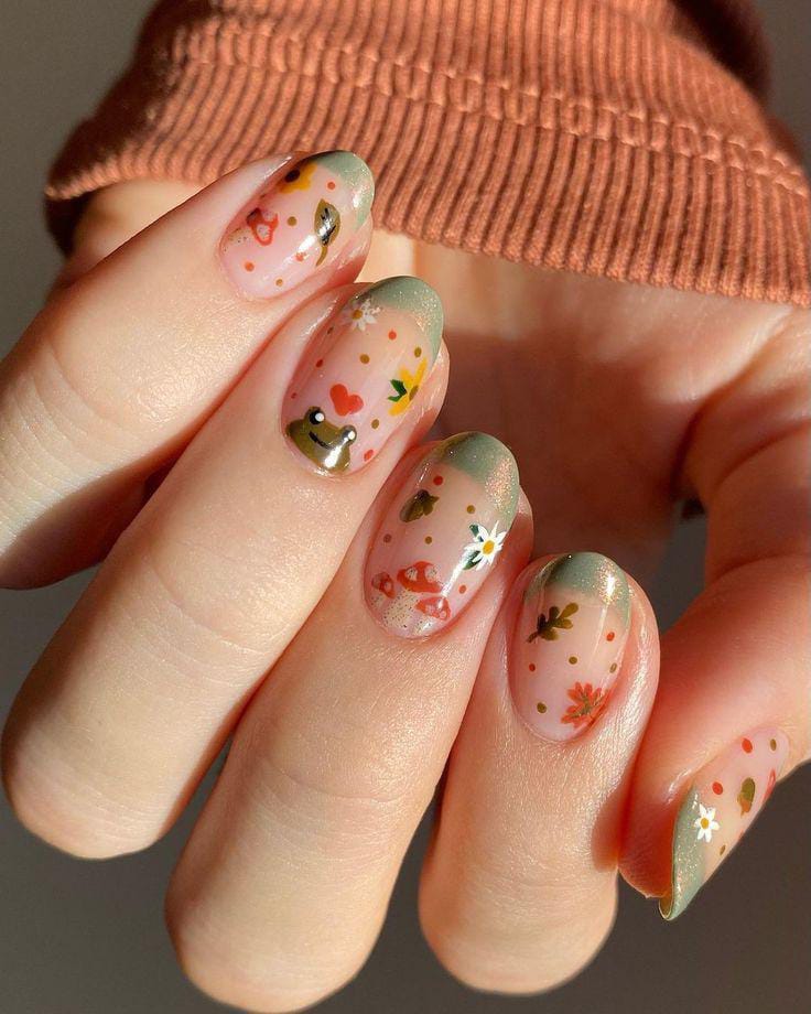 Playful illustrations of tiny leaves, mushrooms, hearts, and flowers come alive on a nude base with subtle green tips. The overall effect feels like stepping into a whimsical woodland walk on a crisp fall day.