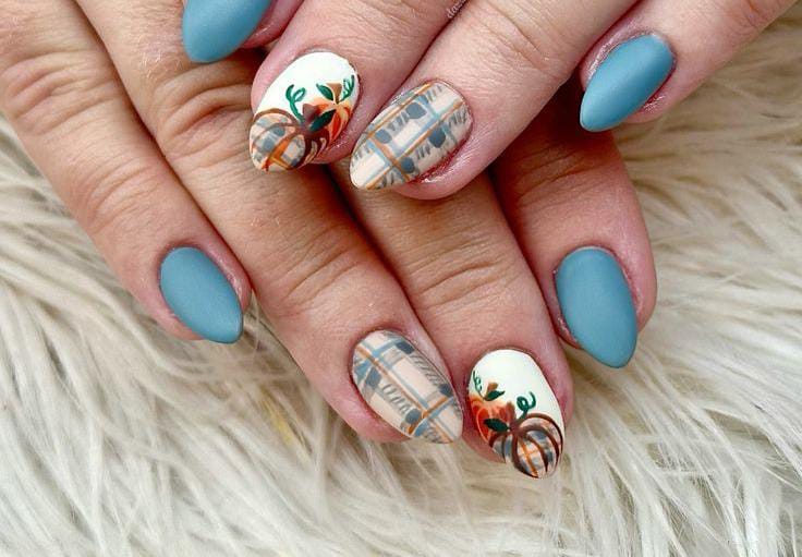Muted matte blues are combined with plaid accent nails and pumpkin artwork, creating a stylish twist on fall classics. The mix of cool and warm tones gives this design a fresh yet seasonal November look.