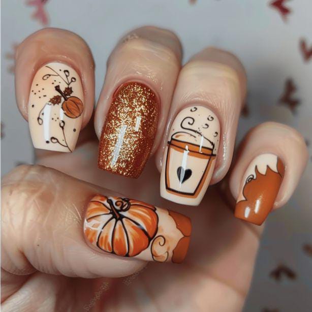 Featuring pumpkins, coffee cup art, golden glitter, and cozy autumn tones, this design is like wearing a warm pumpkin spice latte on your nails.