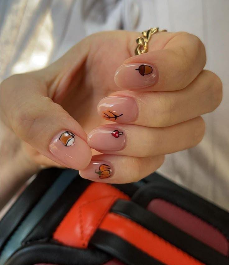Minimalist nude nails with tiny seasonal doodles like pumpkins, acorns, leaves, and coffee cups, creating a chic and playful fall look.