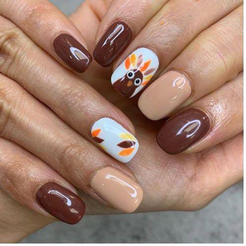 A playful Thanksgiving-inspired look featuring warm browns and beiges, with a cute turkey accent nail and feather details that capture festive charm.