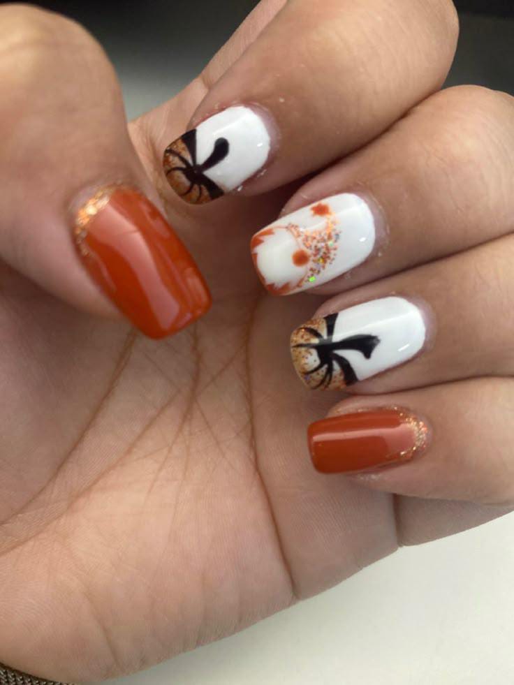Bold pumpkin-orange nails mix with crisp white bases decorated with strokes and golden shimmer pumpkins, giving off cozy autumn warmth.