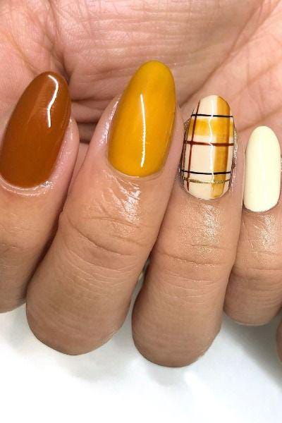 Rich mustard yellow and caramel tones paired with a chic plaid accent nail bring cozy sweater-weather vibes and classic November style.