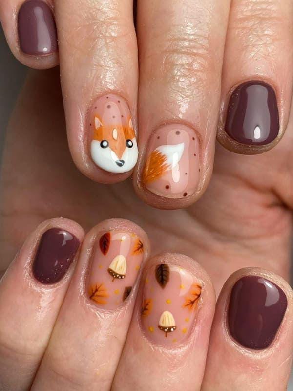 Short, rounded nails feature deep plum tones, playful fox art, and scattered leaves with acorns, bringing a woodland charm to your fingertips. The look is cute yet seasonally elegant.