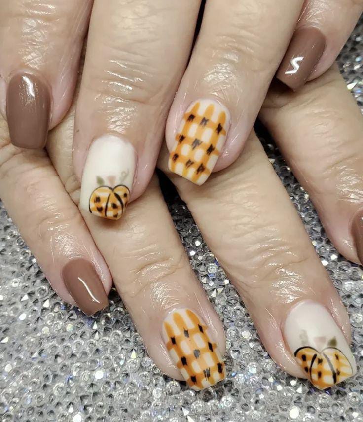 Playful short nails with pumpkins, plaid stripes, and earthy tones paired with hints of animal print, giving a rustic yet trendy November vibe.
