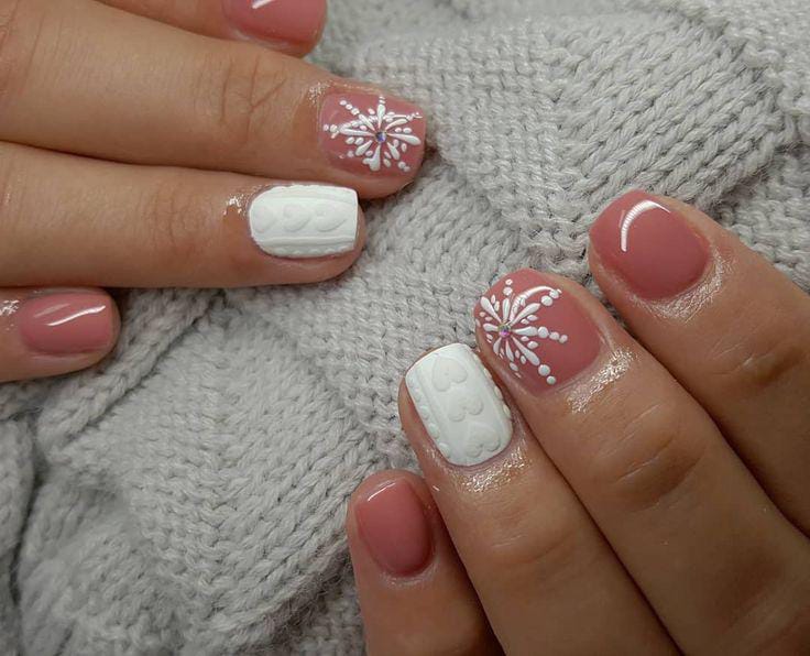 This nude manicure blends glossy and sweater-texture finishes, topped with simple white snowflake accents. It gives a warm, cozy winter feel while still looking soft and feminine.
