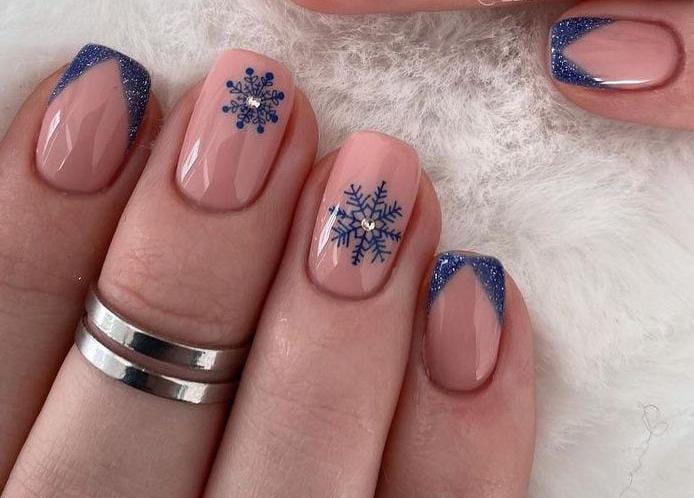 A nude base is paired with deep blue glitter tips and matching blue snowflakes, offering a cool and modern winter vibe. The contrast of warm nude and icy blue gives it a fresh, seasonal look without being too bold.
