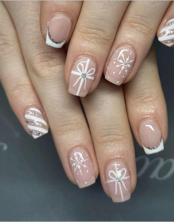 This design pairs a soft nude base with crisp white accents, featuring ribbon-like lines, bows, and minimal striping for a clean, festive winter look. It feels elegant and playful, like tiny wrapped presents on each nail.