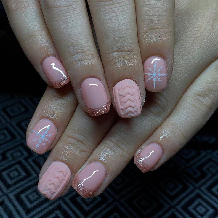A pink nude shade is paired with glitter-tipped edges and a textured knit-sweater accent nail, creating a design that feels both cozy and seasonal. The soft snowflake details add a subtle winter touch.
