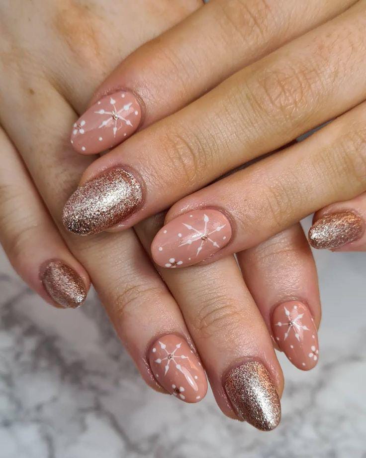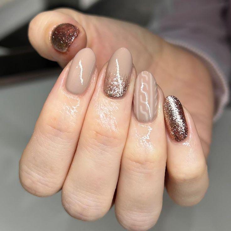 Neutral nude tones are paired with warm gold glitter and a subtle knit-style accent, creating a chic winter look with a touch of sparkle. It feels understated but still festive and seasonal.
