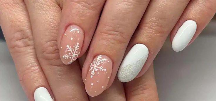 A mix of pure white nails and nude tones decorated with delicate white snowflakes creates a calm, frosty aesthetic. The soft gradients and tiny dots give it a peaceful, snowy- winter day vibe.