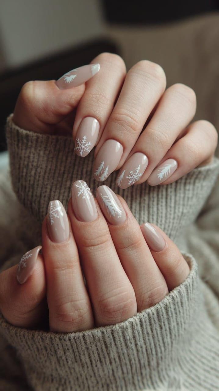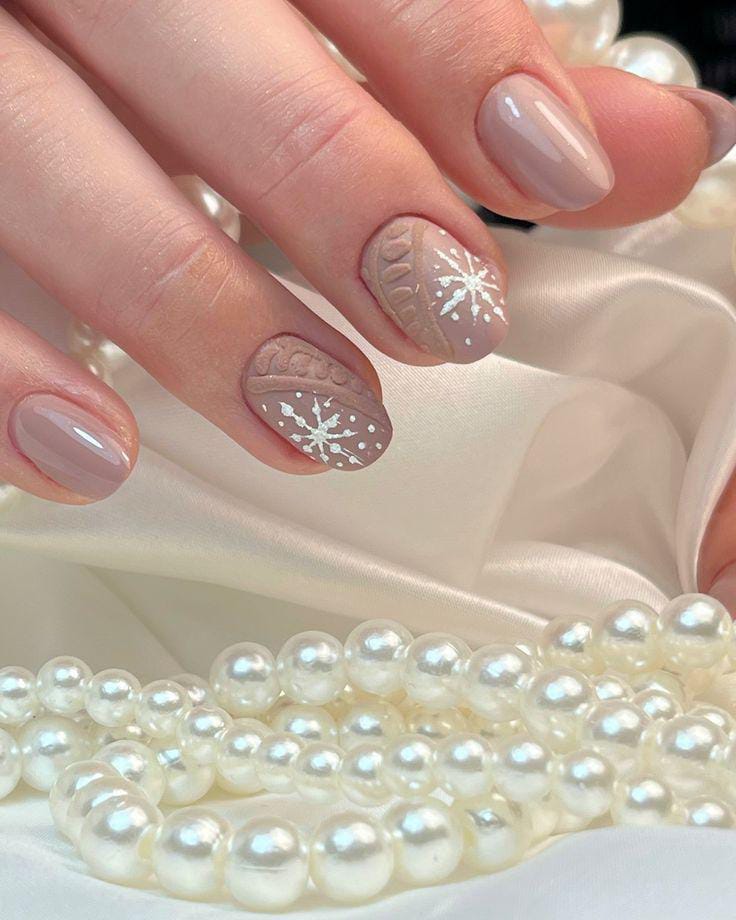 A muted taupe nude base pairs with white snowflakes, ribbon-style lines, and a subtle sweater pattern, creating a clean, frosty, and elegant winter feel.