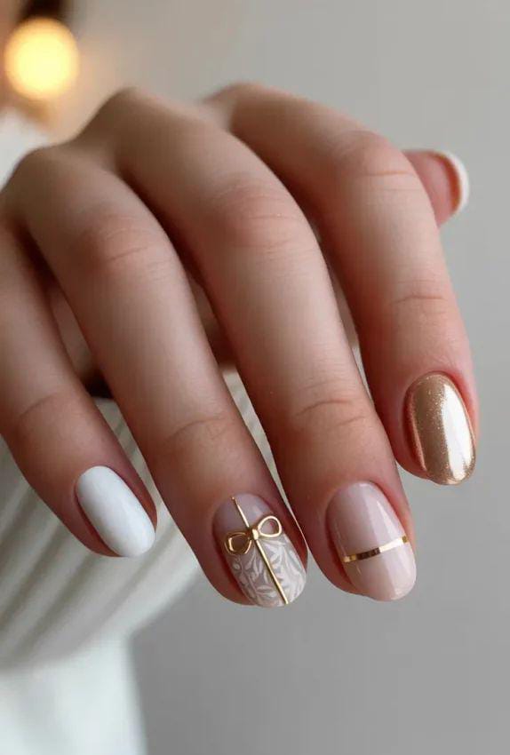 A clean nude palette is paired with crisp white and metallic gold, including a ribbon-styled nail that looks like a tiny wrapped present. It feels minimal yet festive, perfect for a chic winter look.