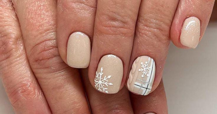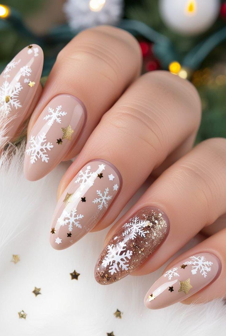This design blends a soft nude base with subtle champagne glitter and delicate white snowflakes, giving the nails a cozy yet festive winter glow.