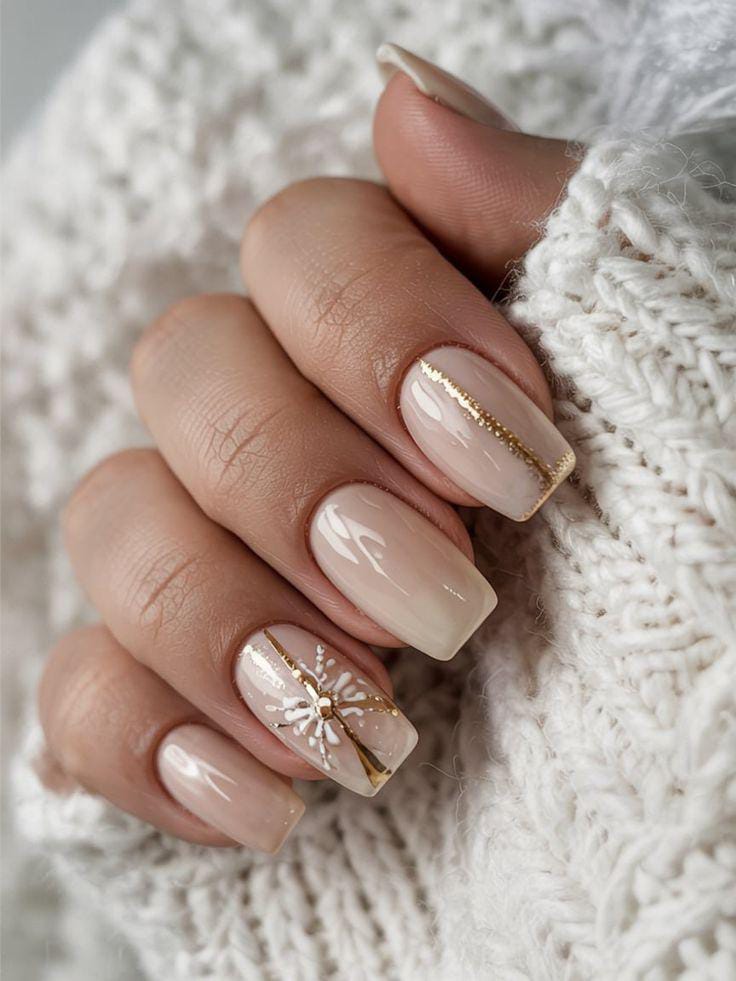 This design features creamy nude nails accented with fine gold striping and a delicate white snowflake, giving the whole look a soft, luxurious winter feel.