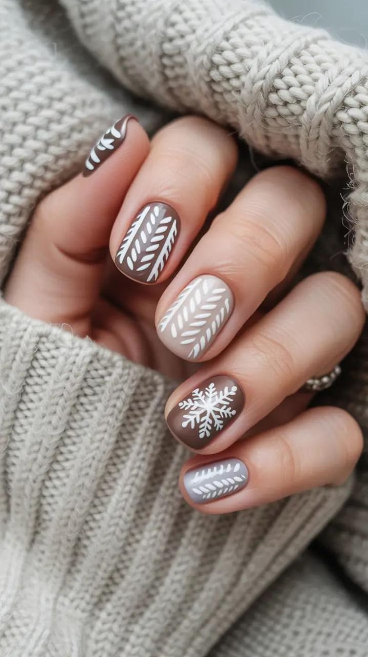 This design mixes taupe nude and soft grey tones with sweater-inspired white patterns and a bold snowflake accent, creating a warm, textured winter look. It feels cozy and rustic, like wearing your favorite knitted pullover.