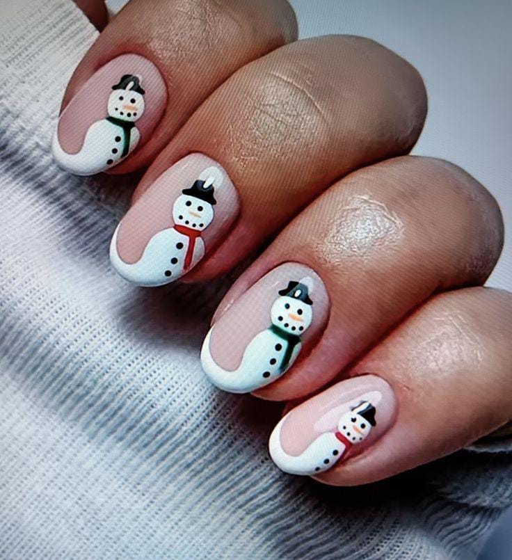 The nails feature a nude backdrop with repeated snowman art along the tips, blending playful holiday cheer with a soft, neutral base. It’s whimsical and cute while still keeping a clean, winter-friendly color palette.