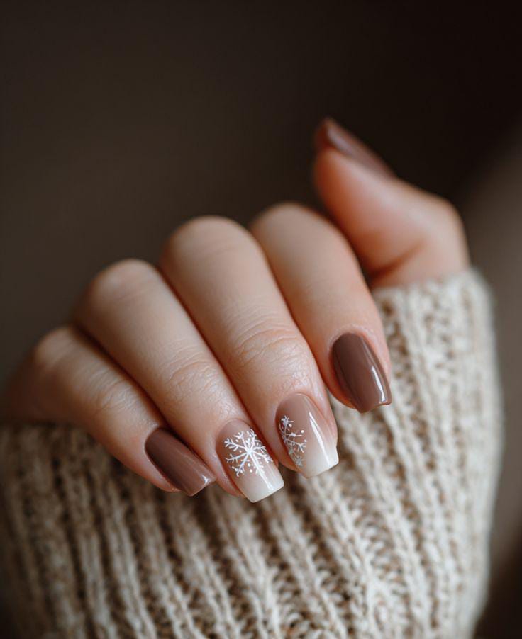 This design pairs warm brown tones with soft nude gradients, highlighted by delicate white snowflakes that add a gentle, wintery touch. It feels cozy, calm, and perfect for a subtle seasonal look.