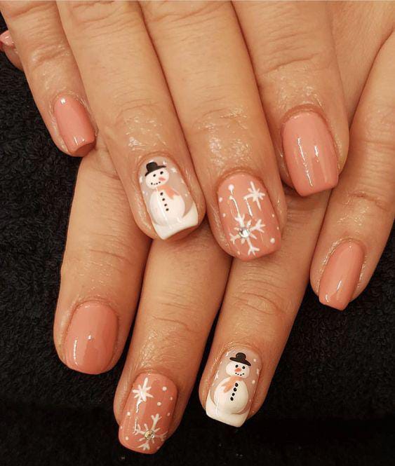 These nude-pink nails mix playful snowman art with snowy white flakes, creating a cheerful and whimsical winter vibe.