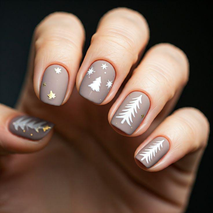 Muted taupe nude nails with matte finish are decorated with white pine trees and tiny stars for a calm, wintry woodland vibe. The design feels cozy, modern, and very winter-season inspired.