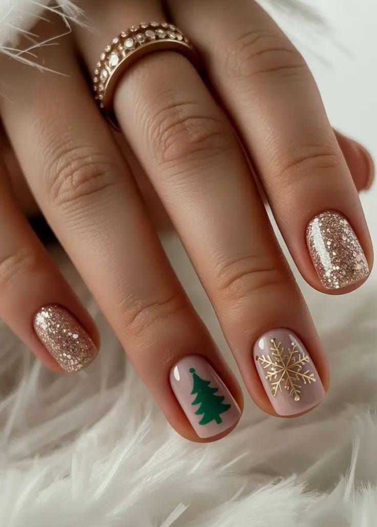 This look pairs nude polish with sparkling gold glitter and cute festive accents like a green tree and a delicate gold snowflake, giving it a warm yet wintry holiday feel.