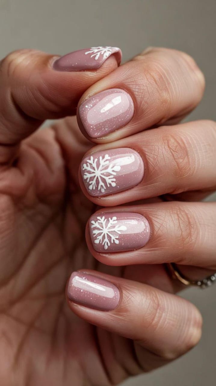 A rosy-nude base with fine shimmer and crisp white snowflakes creates a soft, cozy winter aesthetic that feels elegant and minimal.