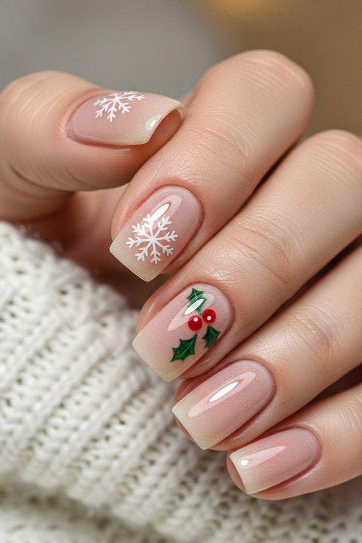 A sheer nude ombre base decorated with dainty white snowflakes and a simple holly accent gives this design a clean, classic, and subtly festive winter look.