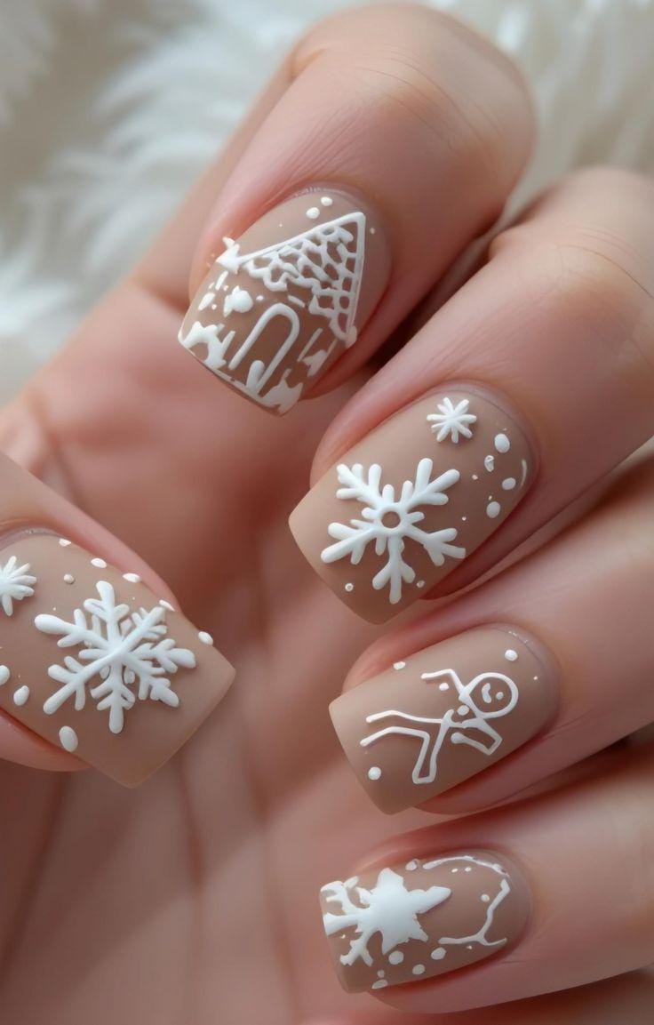This nude design features charming winter elements like snowflakes, pine trees, a snowman, and a tiny gingerbread-style house, all in soft, cozy colors. It brings a cute, storybook winter scene to the nails.
