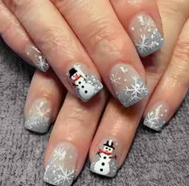 These nails use a cool nude-grey shade with shimmering frosted tips, sparkly snowflakes, and a cheerful snowman accent for a fun, classic winter look.
