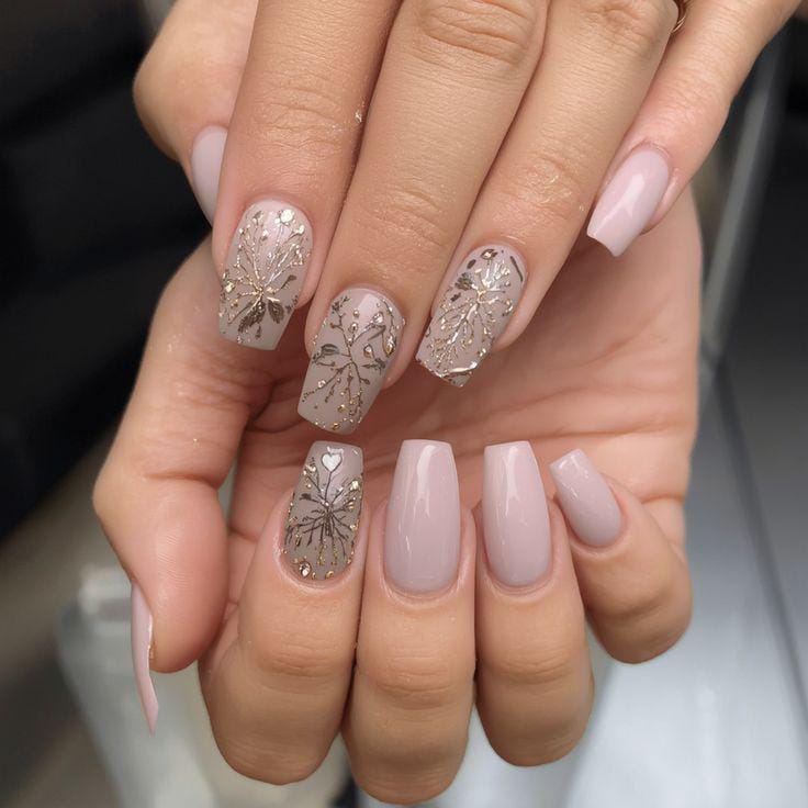 This elegant nude set pairs glossy neutral nails with gold-glitter snowflake accents, blending minimalism and festive shine for a chic winter design.