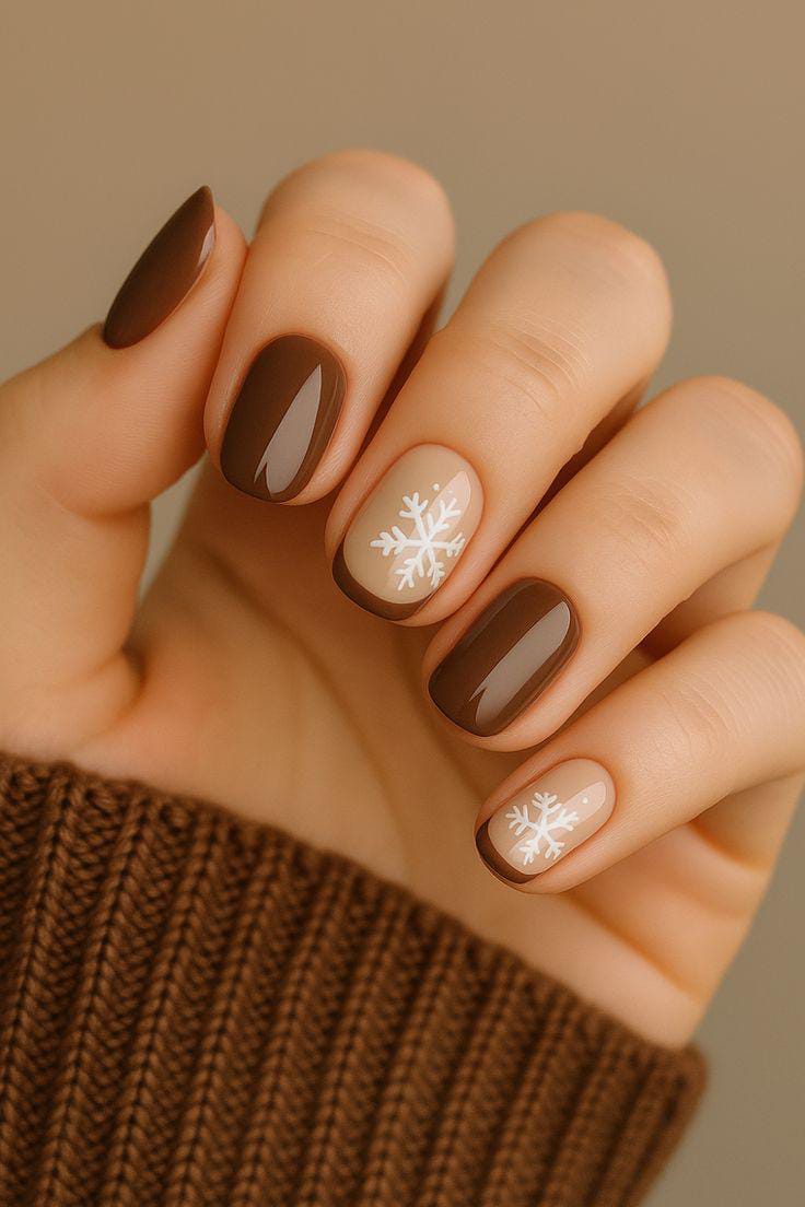 Chocolate-brown nails are paired with nude french accent nails featuring soft white snowflakes and subtle French-style brown tips. It’s warm, earthy, and classic with a hint of winter charm.