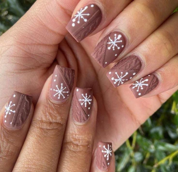 These nails blend a warm, cocoa-brown nude base with sweater-texture accents and simple white snowflakes for a stylish, soft winter look.