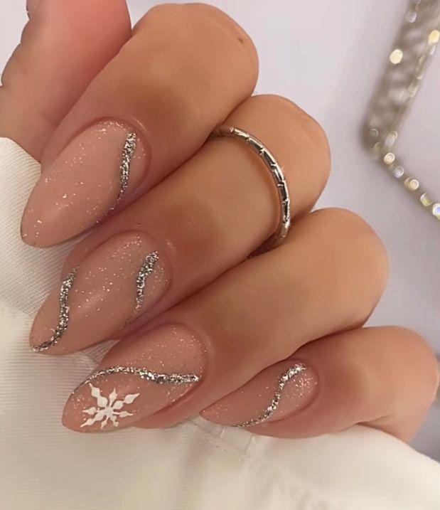This design features a soft nude base with subtle sparkle and flowing silver glitter lines, creating a delicate frosty look. A single snowflake accent adds a wintry touch without overwhelming the minimalist vibe.