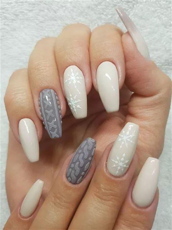 Creamy nude nails paired with grey sweater-texture accents and soft white snowflakes create a polished winter aesthetic. The combination feels warm, refined, and subtly festive.