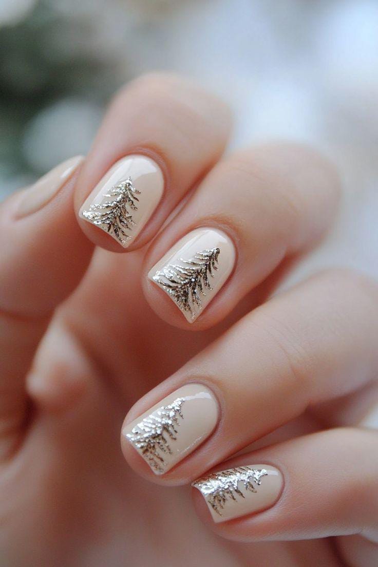 Creamy nude nails are topped with sparkling gold pine-tree silhouettes that add a touch of holiday glimmer. The overall look is elegant, minimal, and perfect for a festive winter finish.