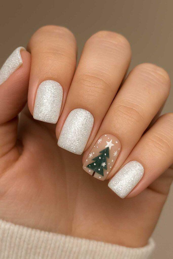 This design pairs soft, frosty white shimmer nails with a single nude accent nail featuring a simple Christmas-tree motif, giving the whole look a cozy yet festive winter feel. It’s minimal, clean, and perfect for subtle holiday vibes.