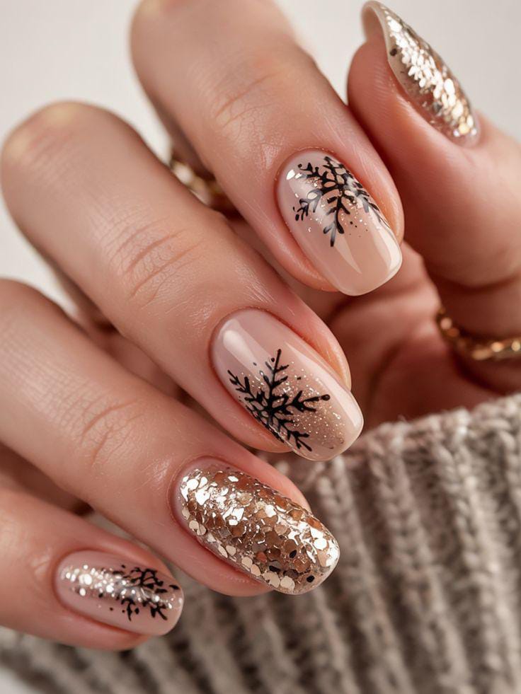 A nude base is elevated with bold black snowflake accents and chunky gold glitter nails, creating a glamorous winter look that feels both warm and eye-catching.