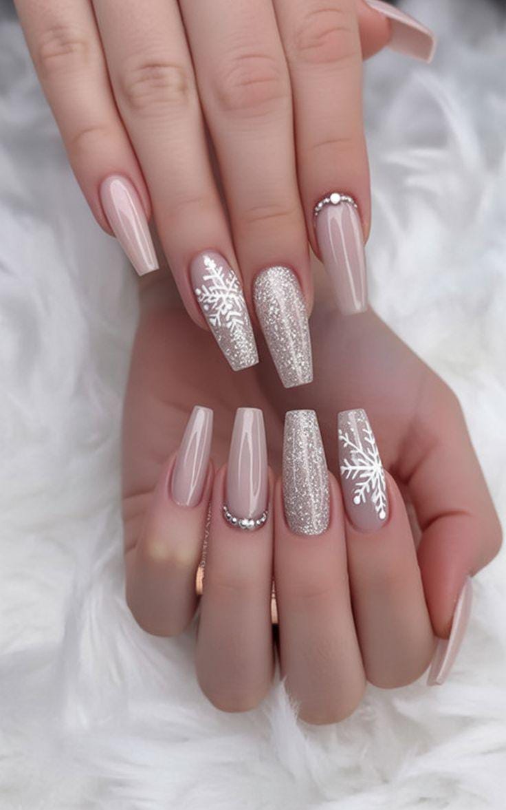 Long nude nails are combined with shimmering silver glitter and crisp white snowflakes, giving the set a soft, icy glow. The look feels luxurious yet wintry, perfect for a polished holiday style.